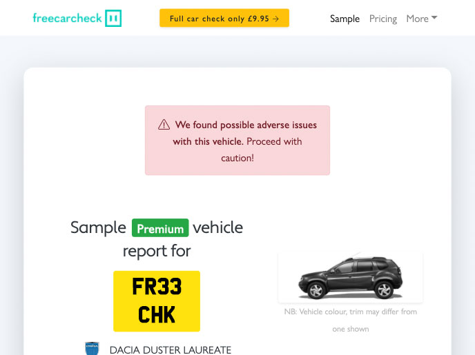 Check out the details for Free Car Check's car data report, including basic and advanced report levels where offered, and a screenshot of a sample report from Free Car Check.
